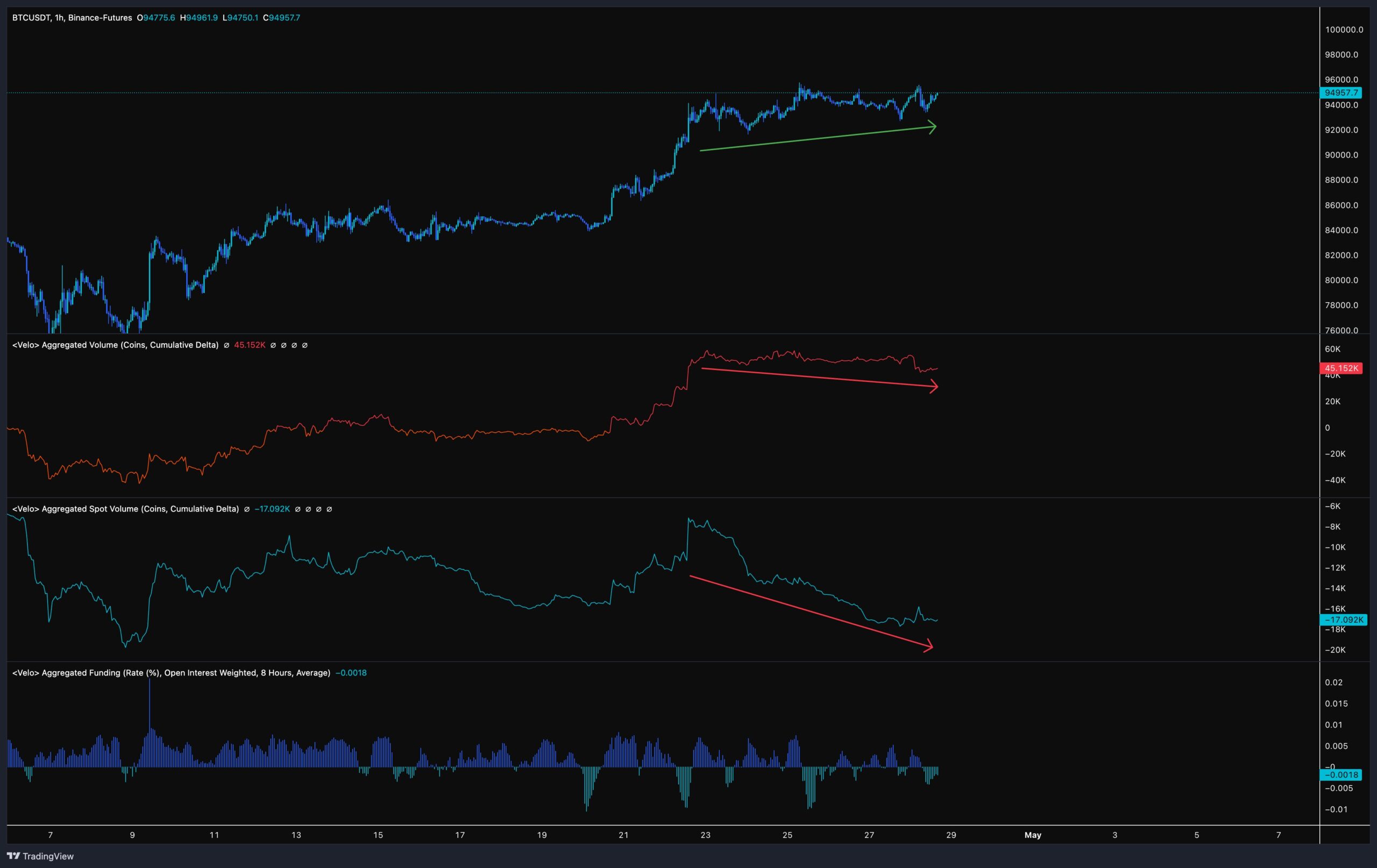 Хубаво импулсивно изглеждащо движение нагоре, последвано от пълно нулиране на спот CVD, но с реално движение на цената нагоре. Ясни признаци за значително поглъщане от страна на продавачите. Междувременно финансирането е отрицателно/неутрално.