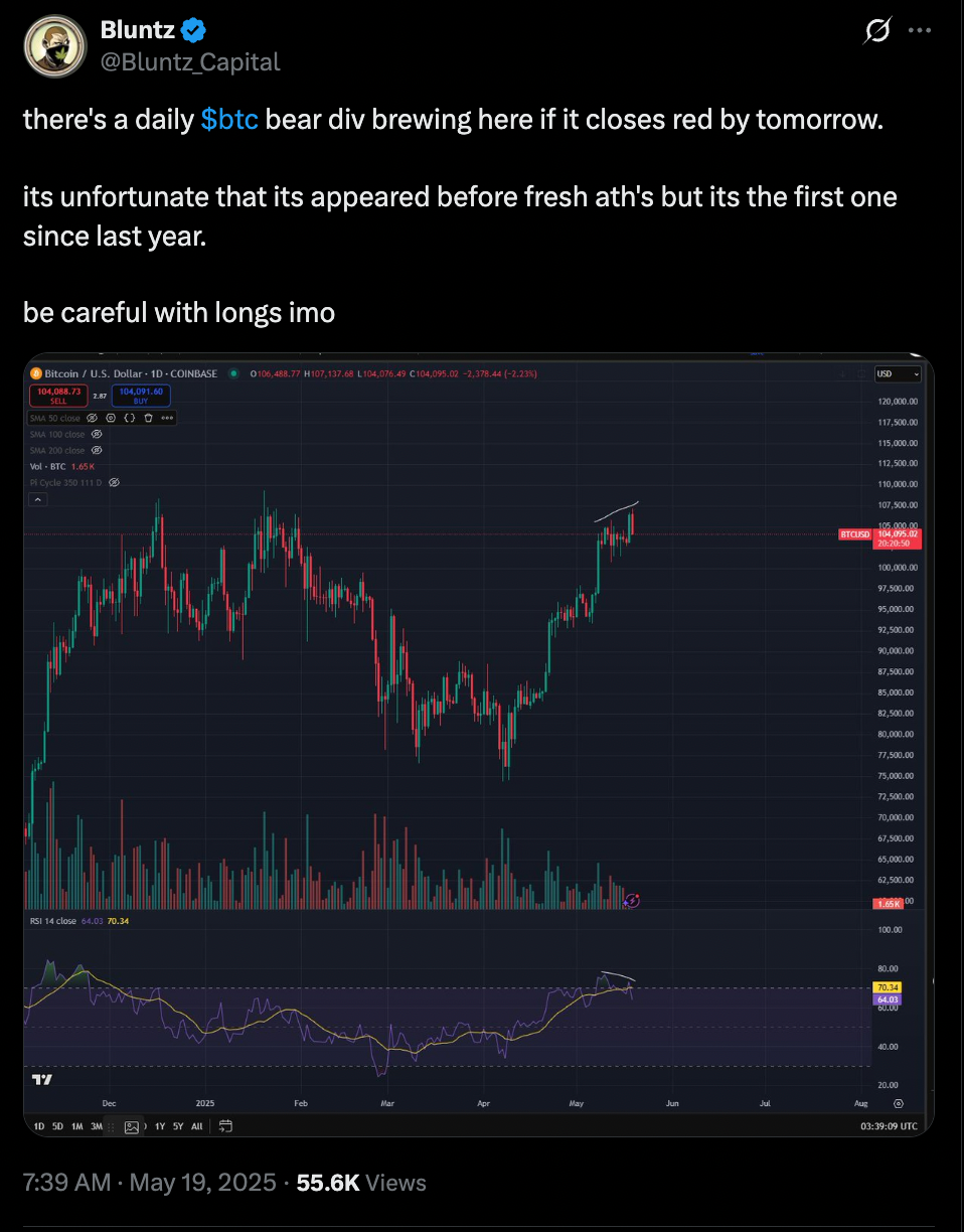 На 19 май BTC се изтласка до нов локален връх над 107 000 USD, но неговият индекс на относителната сила (RSI) отпечата по-нисък връх, потвърждавайки класическа меча дивергенция.