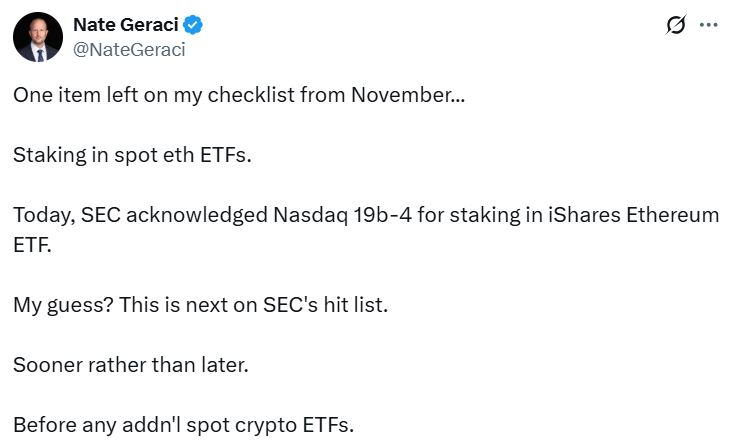 Президентът на NovaDius Wealth Management и ETF анализаторът Нейт Гераци заяви в публикация в X в сряда, че предвид факта, че SEC наскоро одобри заявлението на Nasdaq за добавяне на стейкинг към iShares Ethereum ETF на BlackRock, стейкингът на Ethereum ETF може да бъде следващият в „списъка“ на агенциите.