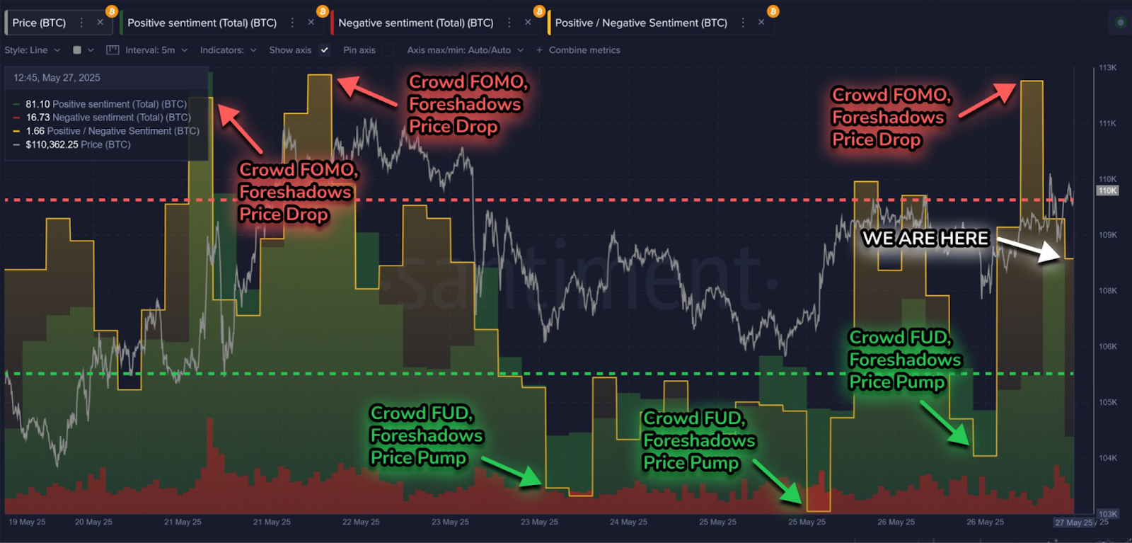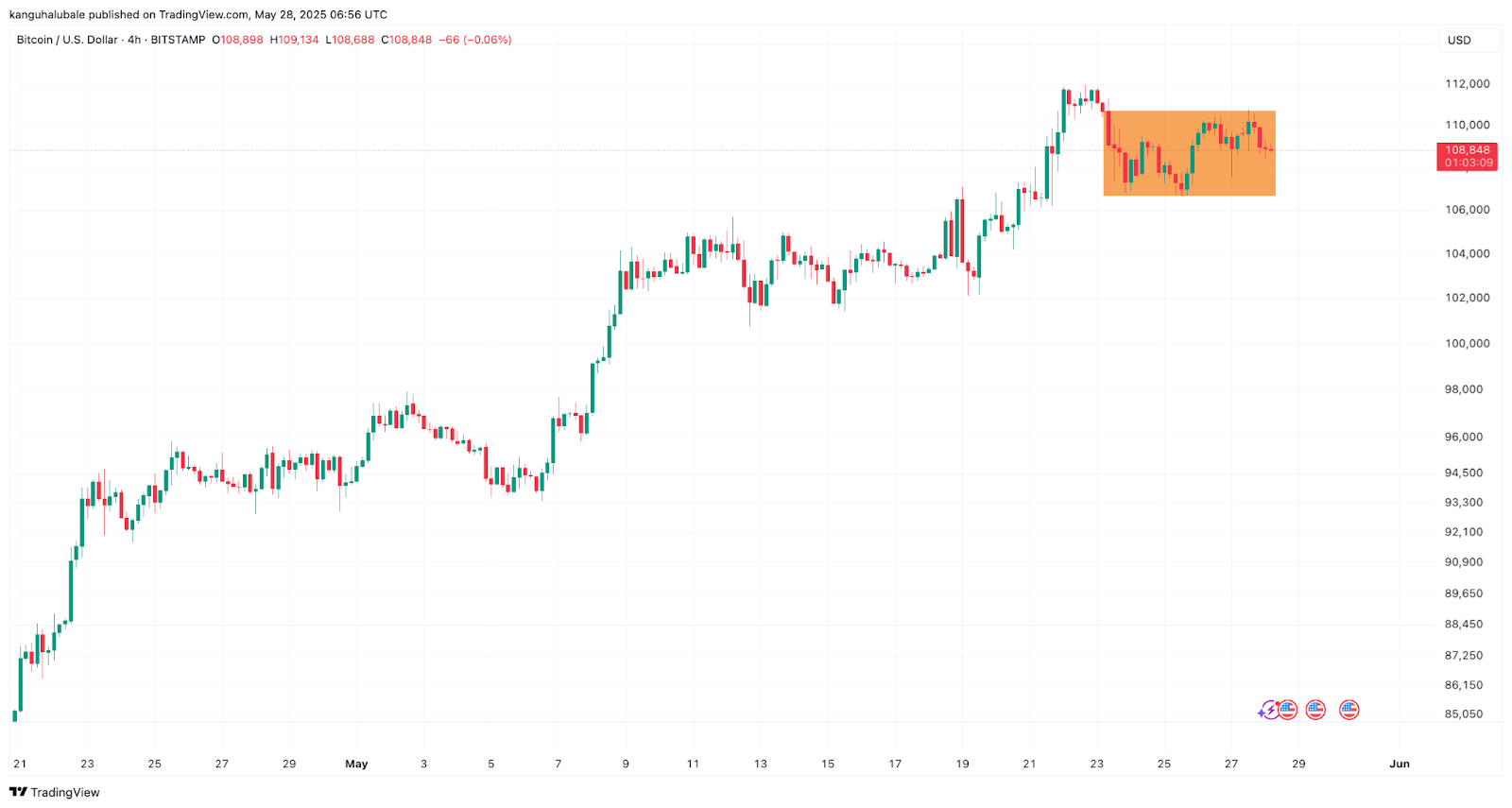 Цената на Биткойн остава заклещена под 110 хил. долара от 23 май насам и данните сочат, че този модел може да продължи още няколко дни на фона на макроикономическата несигурност.