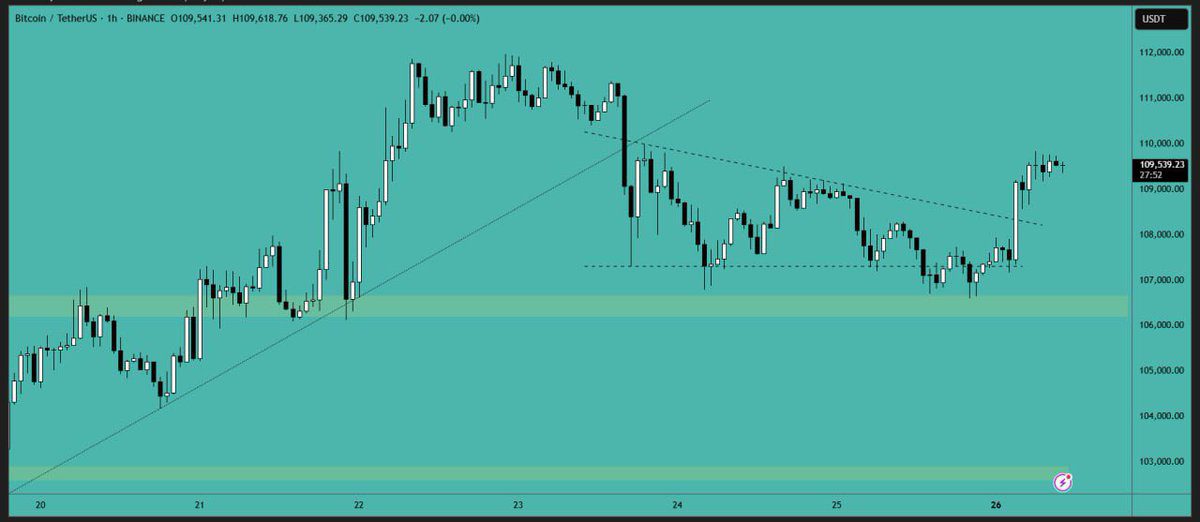 Цената на BTC е „излязла от триъгълния модел и се движи нагоре“, но ключовото ниво на съпротива е на 110 000 долара, заяви анализаторът и търговец BitMonty в последния си анализ на Биткойн на X.