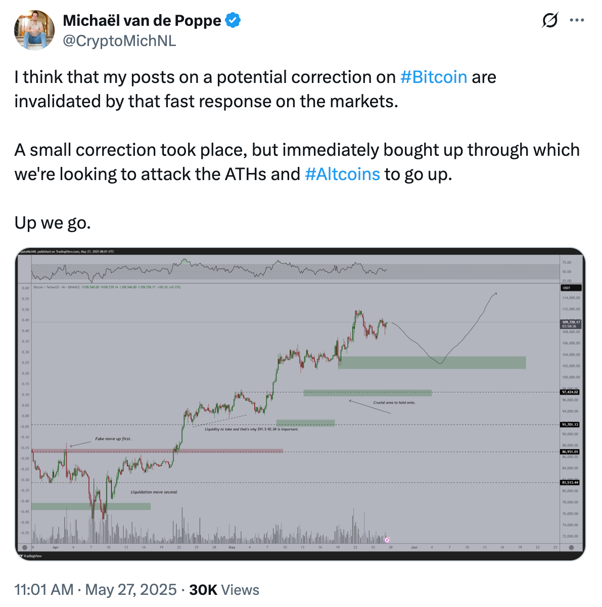 „Има голям клъстер на ликвидността долу при 106 хил. долара и доста седящи от 111 хил. долара и нагоре“, се казва в част от неговия пост на Х. „Основното ниво, на което трябва да се обърне внимание, ще бъдат историческите върхове над 111 000 долара и под тях, чак до 105 000 долара, което беше началото на неотдавнашното движение.“